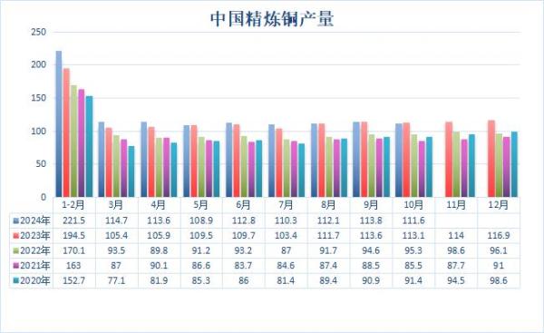 国家统计局最新数据显示,中国10月精炼铜(电解铜)产量为111.6万吨,同比减少1.3%。