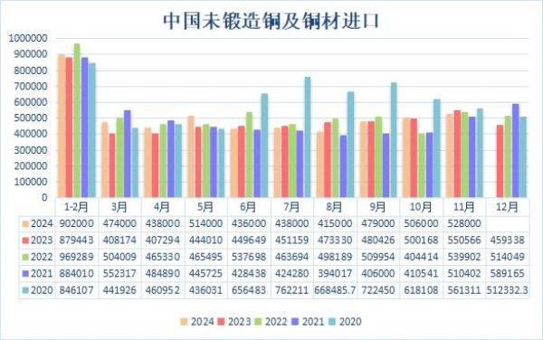 海关总署数据显示,中国2024年11月未锻轧铜及铜材进口量为52.8万吨,较10月增长4.3%,虽然不及去年同期水平,但是创下了近一年单月高位,受来自非洲的船货和国内补充库存采购提振。