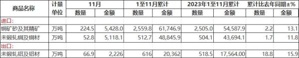 1-11月累计进口量为512.7万吨,较去年同期的504.1万吨增加1.7%。11月铜价出现回落,国内需求仍有韧性,社会库存不断下降,进口需求增加。