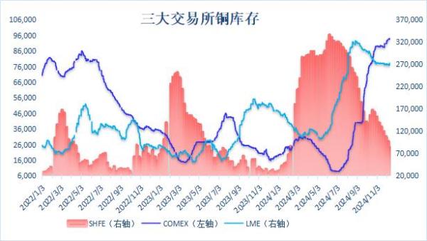 上海期货交易所最新公布数据显示,12月13日当周,沪铜库存继续下滑,周度库存减少13.5%至84,557吨,降至十个月新低。国际铜库存增加3317吨至18,507吨。 上周,纽铜库存整体继续增加,最新库存水平为94,035吨,再刷近六年新高。 注:一般来说,国内外交易所库存不断下降将对期价形成支撑,反之,则对期价有所利空。