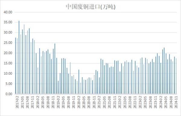 海关总署在线查询数据显示,中国11月废铜进口量为17.35万吨,环比下降5.25%,同比减少5.12%。其中美国和日本供应量仍然数一数二,输送量都有小幅下降。