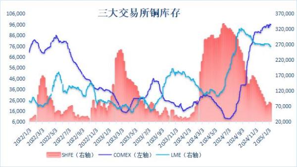 上海期货交易所最新公布数据显示,1月10日当周,沪铜库存有所回落,周度库存减少5.41%至78,678吨。国际铜库存持稳于11,596吨。