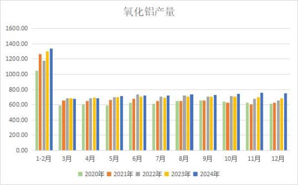 国家统计局发布报告显示,2024年12月中国氧化铝产量为750.8万吨,同比增加10.1%,环比略有回落。