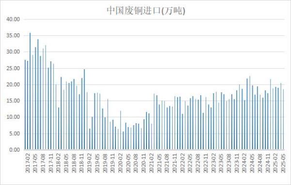 海关总署在线查询数据显示,中国5月废铜进口量为18.52万吨,环比减少9.55%,同比下降6.53%。