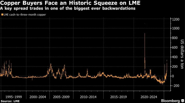 行情数据显示,周一现货铜价一度较三个月期货价格高出了280美元/吨,创下自2021年创纪录飙升以来的最大价差。这一巨幅现货溢价(即逆价差)表明供应短缺,而此前几个月LME库存正在迅速下降。