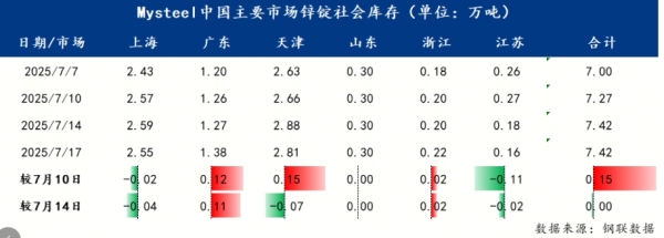 截至本周四(7月17日),七地锌锭库存总量为9.35万吨,较7月10日增加0.33万吨,较7月14日增加0.05万吨,国内库存录增。周内广东及天津地区到货增多,叠加下游需求减淡,库存增加较为明显。上海周内国产到货较少,主要以消耗库内原有库存为主,因此库存出现小幅下降。整体来看,原三地库存增加0.05万吨,七地库存增加0.04万吨。