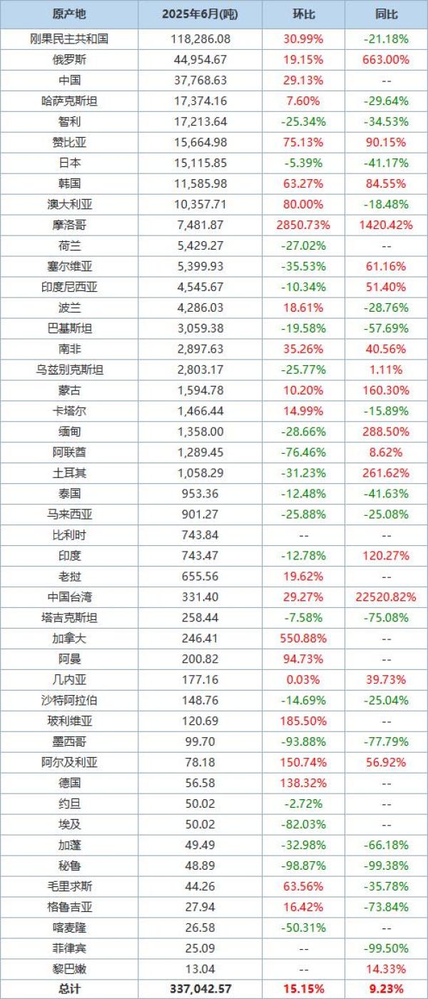 刚果民主共和国是第一大供应国,当月从刚果民主共和国进口精炼铜118,286.083吨,环比增加30.99%,同比下降21.18%。